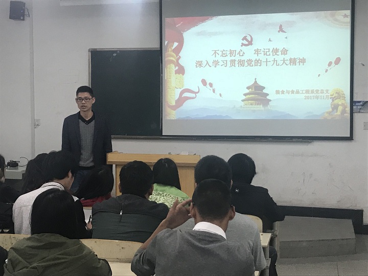 党的十九大于2017年10月18日至10月24日在北京胜利召开,为学习贯彻党的十九大精神,11月2日晚,粮食与食品工程系学生党支部组织举行了“学习贯彻党的十九大精神,争做新时代六有大学生”主题党课,全体学生党员、入党积极分子和各班级团支书参加。