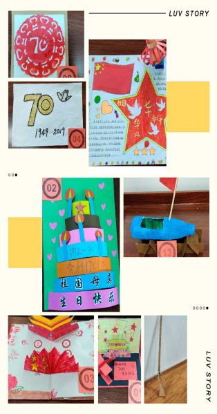 活动伊始,慷慨激昂的国歌,庄严的宣誓,显露出每个人对祖国的自豪,手工艺作品的展示,饱含了每个人对祖国的祝福,视频《中国的七十年》带领大家回顾了新中国成立以来的发展历程,一首《我和我的祖国》深情的表白,唱出了我们心中的赞歌。