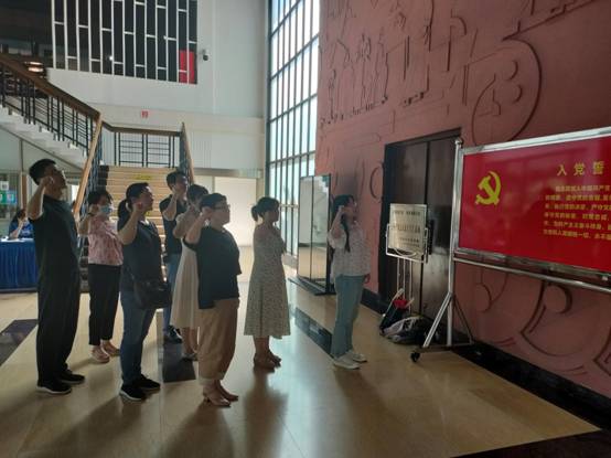 在纪念馆,全体党员面对鲜红的党旗,举起右手,再次感受入党宣誓时的庄严承诺和坚定决心,更加坚定理想信念,不忘初心,牢记使命。