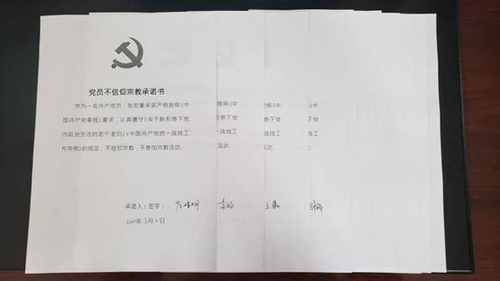 最后,全体党员签订《党员不信仰宗教承诺书》,并保证不断加强自身思想教育,严守党章规定,坚定理想信念,牢记党的宗旨,绝不在宗教中寻找自己的价值和信念。