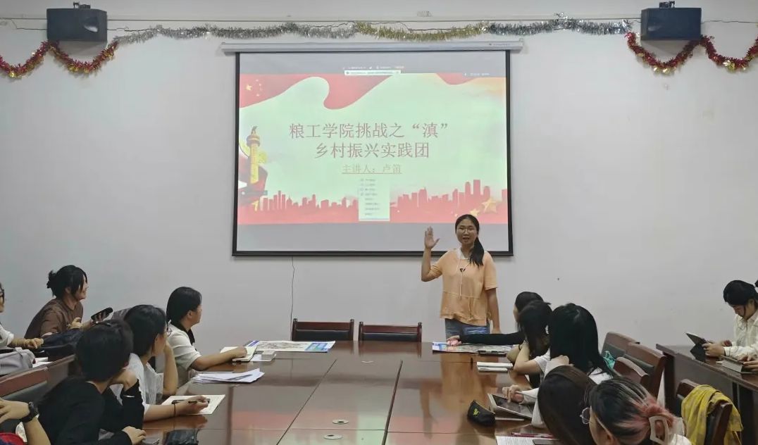 随后,卢笛同志分享了《粮工学院挑战之滇——乡村振兴实践团》云南三下乡实践之旅,强调了大学生应该积极在乡村振兴的大舞台上建功立业,厚植爱农情怀、练就兴农本领,深入学习贯彻习近平总书记关于“三农”工作的重要论述。