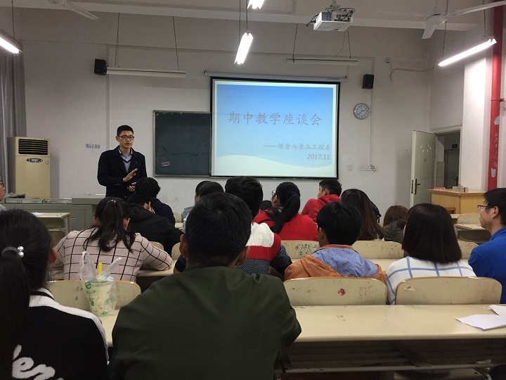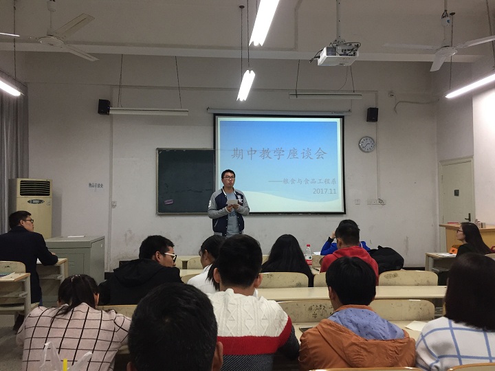 本网讯(通讯员 杨欣悦)2017-2018学年第一学期的学习生活已过半,为了检验教学质量,提高教学效果,进一步推动本系学风建设,粮食与食品工程系于11月8日晚上6点30 分在知新楼104教室召开了期中教学检查学生座谈会。本次座谈会由粮食与食品工程系党总支副书记冯书祥主持,各位任课教师和各班级的学生代表参加。