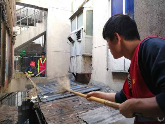 到达袁家社区后,在社区负责人的引导下,我们志愿者一共分成3组,分配在不同的工作岗位上。志愿者们不怕苦,不拍累,拿起扫帚就干。风虽然大,但没有人嫌弃,没有人嫌累,低头苦干,热火朝天。