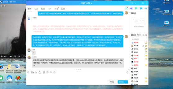 食科1701:此次线上主题团日活动,首先又团支书为大家讲解总书记的回信,并针对总书记的回信,向大家提出两个问题:一是对国家抗击疫情采取措施的认识;二是当代青年的价值观和责任担当是什么。同学们都积极的参与并在群中留言。最后郭雅纯老师也针对总书记的回信提出自己的见解,也向同学们提出宝贵的意见。