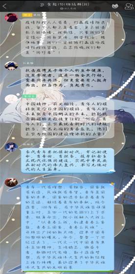 食科1802:3月15日,习近平总书记给北京大学援鄂医疗队全体“90后”党员回信,向他们和奋斗在疫情防控各条战线上的广大青年致以诚挚的问候。他在回信中表示,“广大青年用行动证明,新时代的中国青年是好样的,是堪当大任的!”既表达了对青年战“疫”成绩的高度赞扬,也体现了党中央对当代青年的殷切期待。为深入学习贯彻习近平总书记给北京大学援鄂医疗队全体“90后”党员回信精神,凝聚众志成城抗击疫情的强大青春力量,我校团委决定在我校开展“学总书记回信,话青春担当”线上主题团日活动。此次活动同学们都认真学习并了解祖国的伟大,和奋战在抗疫前线的无名英雄的伟大。