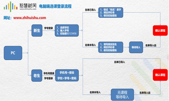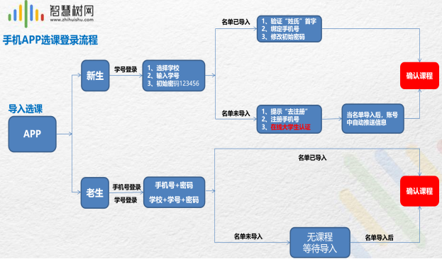 u 新生初次报到流程:①在智慧树门户(www.zhihuishu.com) 使用学号和初始密码123456登录;②验证 “姓氏”首字 ;③绑定手机号;④确认课程