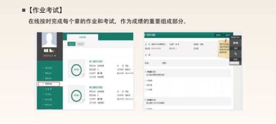 进入个人账号后,点击【去学习】完成课程视频观看,点击【作业考试】完成章测试和期末考试,以及见面课。随时查看学习进度条和各部分得分。