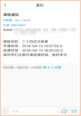 注意:单门课程的学期时间请在“消息”—“通知”里面的本门课程通知查看,学习记录在“详情”中查看。