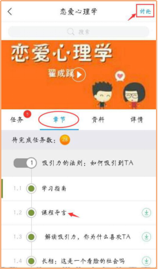 第四步:切换“章节”,单击章节名称学习课程视频;右上角进入“讨论区”参与课程讨论