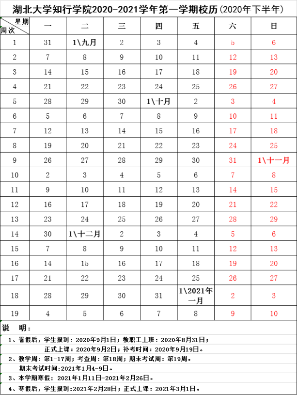 2020-2021学年第一学期校历