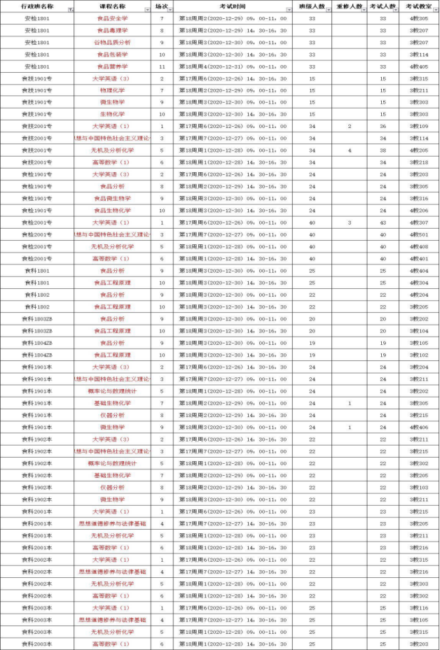 粮工学院期末考试课程安排