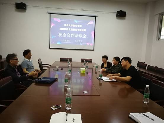 5月17日,湖北阿帆食品股份有限公司董事长胡晓军来beat365官网进行校企合作洽谈,刘齐院长主持了会议,祝方清书记和杨登想教授等参与了会谈。