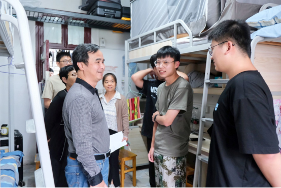 校领导陈刚走访了每一个男生寝室,关心学生来校适应情况,了解同学们对改造后学生宿舍设施和服务保障的感受,鼓励他们积极发挥特长,积极参与活动。强调专业教师、辅导员都要经常深入学生,了解学生诉求,激发学生学习兴趣,共同帮助同学们尽快更好适应大学生活。