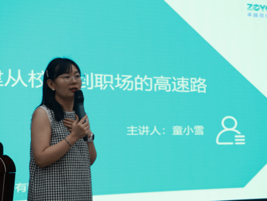 第二位嘉宾是童小雪女士,她是武汉光谷卓越科技股份有限公司副总经理、光谷经理人联合会副会长、中南民族大学企业导师,还拥有高级经济师、一级人力资源管理师、薪税师等专业资质。童小雪女士围绕《搭建从校园到职场的高速路》这一主题展开讲座,她结合自身在光谷科技产业的丰富经验,为同学们细致解读了从校园到职场的过渡路径,分享了实用的求职技巧与职业规划建议。