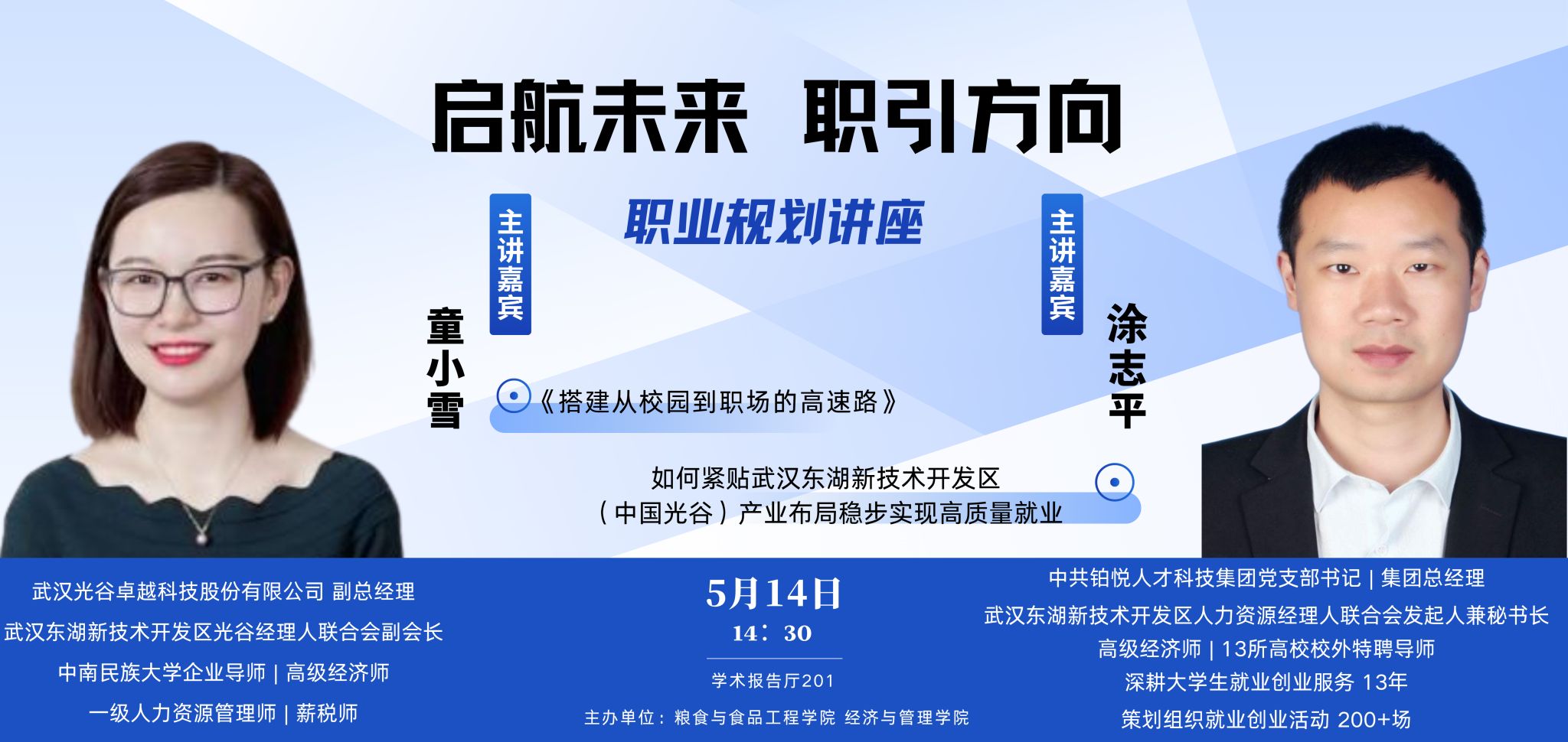 2025 年 5 月 14 日下午,由粮食与食品工程学院和经济与管理学院联合主办的“启航未来 职引方向”大学生职业生涯规划系列专题讲座,在学术报告厅 201 顺利举行。本次讲座旨在助力同学们明确职业方向,提升就业竞争力,为未来的职业发展筑牢根基。