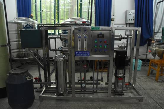纯净水生产实验室于2011年组建,使用面积近50m2,主要用于食品科学与工程大类全体学生的实验教学和专业实训室,主要承担纯净水生产课程的实验与实训教学工作。该生产线主要由多介质过滤、活性炭过滤、反渗透、高压泵等设备组成,采用二级反渗透制取纯净水生产技术。