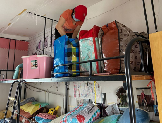 被毕业生亲切的称呼“萌姐”的张忠萌老师,与毕业的同学们视频连线一件件确定需要打包邮寄的物品,不顾胳膊、腿上被蚊子饱餐一顿叮咬了大大小小的十多个包,仍旧认真的在床铺上叠好学生衣服。