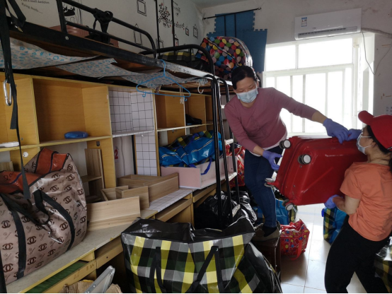 粮工学院许多老师住所分布在汉阳、武昌、东西湖区,离学校较远。章焰老师上午在家给学生上完四节在线网络课程后,中午抓紧时间将待在家里上网课的孩子安顿好后,立即从汉阳赶赴30公里路程到达学校,刘爱红老师上午三四节课结束网课,骑自行车赶往学校,陈洁老师从武昌赶来,老师们刚完成教学工作便又马不停蹄地投入到学生寝室的整理工作中来,细致又周到地将学生们的行李箱、被子、棉絮、书籍和生活用品等物件排放整齐,寝室房间打扫干净。刘爱红老师和陈洁老师对毕业班的寝室清理特别仔细,将鞋垫、订书机、伞、插电板等小物件都一一拍照,询问毕业班同学是否需要打包快递,有的同学犹豫不决,又想把已经决定不要了的保留下来,直到晚上还在联系两位老师,为了最大程度的满足学生的需求,刘爱红老师不厌其烦,第二天一早又返回去将其寻回放置好,只为学生不留遗憾。